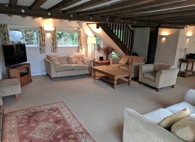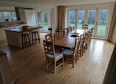 On the ground floor is a large sitting room with exposed oak beams and inglenook fireplace. A huge light and spacious kitchen / dining room with dining table for twelve overlooking the gardens and fields.
